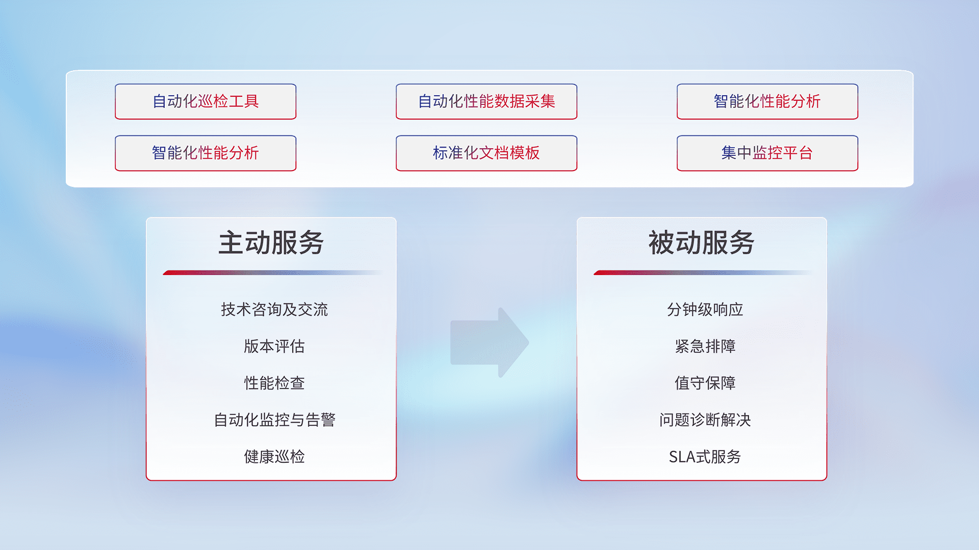 智能化工具和标准化文档,,,保障服务质量,,,,提供主动服务(包含技术咨询、、版本评估、、、、性能检查、、自动化监控与告警、、、健康巡检)和被动服务包含(分钟级响应、、、紧急排障、、值守保障、、、问题诊断解决、、、SLA服务)。。
